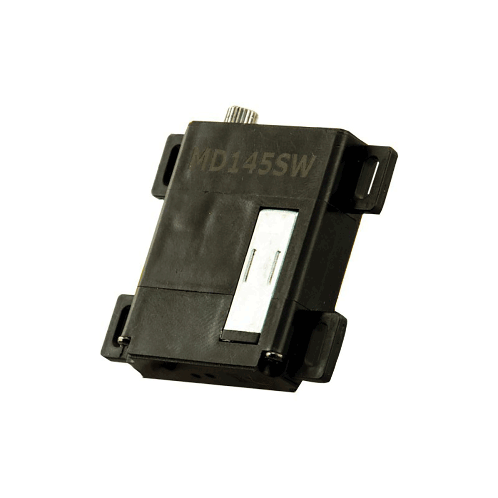 The low profile MD145MW is a 10mm, steel gear, sub 1 oz servo with dual ball bearings, cored motor, and contactless magnetic encoder. This discrete package offers high performance and reliability for robotic and remote, unmanned aerial applications where space is at a premium. Operating via PWM command protocol at a wide voltage range from 4.8~7.4 volts, the unique MD145MW servo produces impressive torque and speeds in its class.